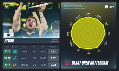 BLAST鹿特丹公开赛EVP:ZywOo领衔,apEX落选全明星